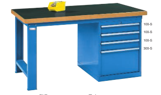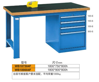 工作臺WB187504介紹: 工作臺采用優(yōu)質(zhì)冷扎板精工制作而成,堅固的工作桌框架,牢固平穩(wěn),可使工作桌承重1000kg;多種工作桌面選擇,可配合不工使用的要求; 該工作臺配置了50厚高分子復合臺面,適用于檢測,維修等;工作臺左側(cè)配3*100,1*300四抽落地柜,抽屜可配分格,有利于現(xiàn)場物料的整理,規(guī)劃。