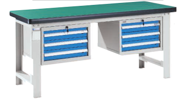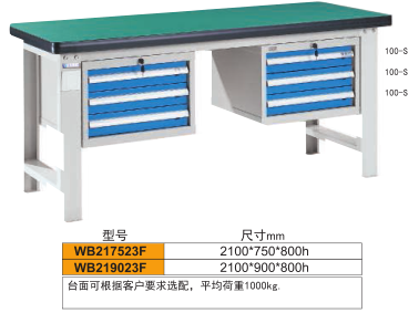 工作臺介紹WB-217523: 工作臺采用優(yōu)質(zhì)冷扎板精工制作而成,堅固的工作桌框架,牢固平穩(wěn),可使工作桌承重1000kg;多種工作桌面選擇,可配合不工使用的要求; 工具吊柜(箱),側(cè)柜(箱)燈架,調(diào)節(jié)腳杯,外形美觀;層板,抽屜質(zhì)量上乘,承重大,抽屜內(nèi)可根據(jù)需要任意分隔;節(jié)約空間,適用性強(qiáng)