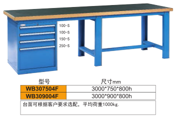 工作臺(tái)WB307504介紹: 工作臺(tái)采用優(yōu)質(zhì)冷扎板精工制作而成,堅(jiān)固的工作桌框架,牢固平穩(wěn),可使工作桌承重1000kg;多種工作桌面選擇,可配合不工使用的要求; 工具吊柜(箱),側(cè)柜(箱)燈架,調(diào)節(jié)腳杯,外形美觀;層板,抽屜質(zhì)量上乘,承重大,抽屜內(nèi)可根據(jù)需要任意分隔;節(jié)約空間,適用性強(qiáng)