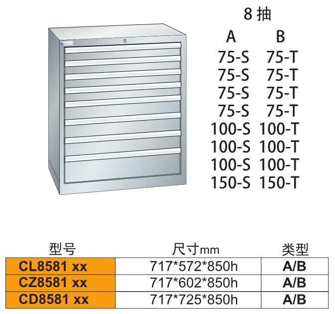 工具柜工具柜C-8581介紹:工具柜適用于工具、刀具、零部件在生產(chǎn)現(xiàn)場中的定置管理,8抽抽屜式設(shè)計,使你的物品存取工作真正做到準時、準確、卓效、低耗。