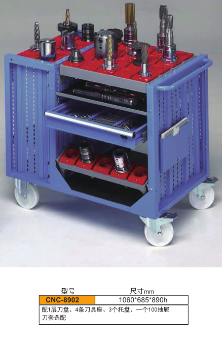 刀具車是存放、搬運刀具的裝備,此類刀具車可存BT30、BT40、BT50、HSK63、HSK100等多種型號的刀具。多邊成型的整體式側(cè)板上有模數(shù)化的人字孔,可將刀座按水平或15°、30°傾斜放置,方便多種刀具的存取。 高強度腳輪,車前為兩個定向輪,車后為兩個萬向帶 剎車輪,推行平穩(wěn),方向性好,剎車固定后不會滑動。