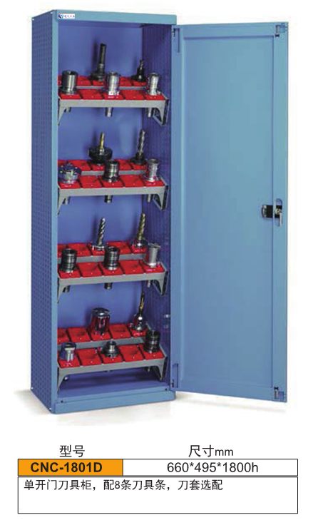 刀具柜,是專門用來存放各種車床上常用刀具的柜子。刀具柜的柜體一般采用冷軋鋼板制成,堅(jiān)固耐用。刀具柜內(nèi)常有3-5個(gè)橫檔可拉抽屜,抽屜內(nèi)有ABS材質(zhì)的刀具套,防滑防油,以便刀具自由組合式的存放。刀具柜一般都為雙門對(duì)開式,柜體裝有可調(diào)式腳墊,柜體可調(diào)整高度,柜子防滑防潮。刀具柜常用在工廠機(jī)加工中心,便于刀具的集中管理,取用方便。