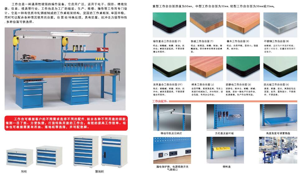 可選擇臺(tái)面板(復(fù)合,櫸木,鋼板,不銹鋼)、箱體、掛板(百葉/方孔/置物盤(pán)/多種組合 )、掛鉤、物料盒、插座等其他配件