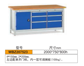 組合工作臺介紹: 工作臺采用優(yōu)質(zhì)冷扎板精工制作而成,堅固的工作桌框架,牢固平穩(wěn),可使工作桌承重1000kg;多種工作桌面選擇,可配合不工使用的要求; 工具吊柜(箱),側(cè)柜(箱)燈架,調(diào)節(jié)腳杯,外形美觀;層板,抽屜質(zhì)量上乘,承重大,抽屜內(nèi)可根據(jù)需要任意分隔;節(jié)約空間,適用性強(qiáng)